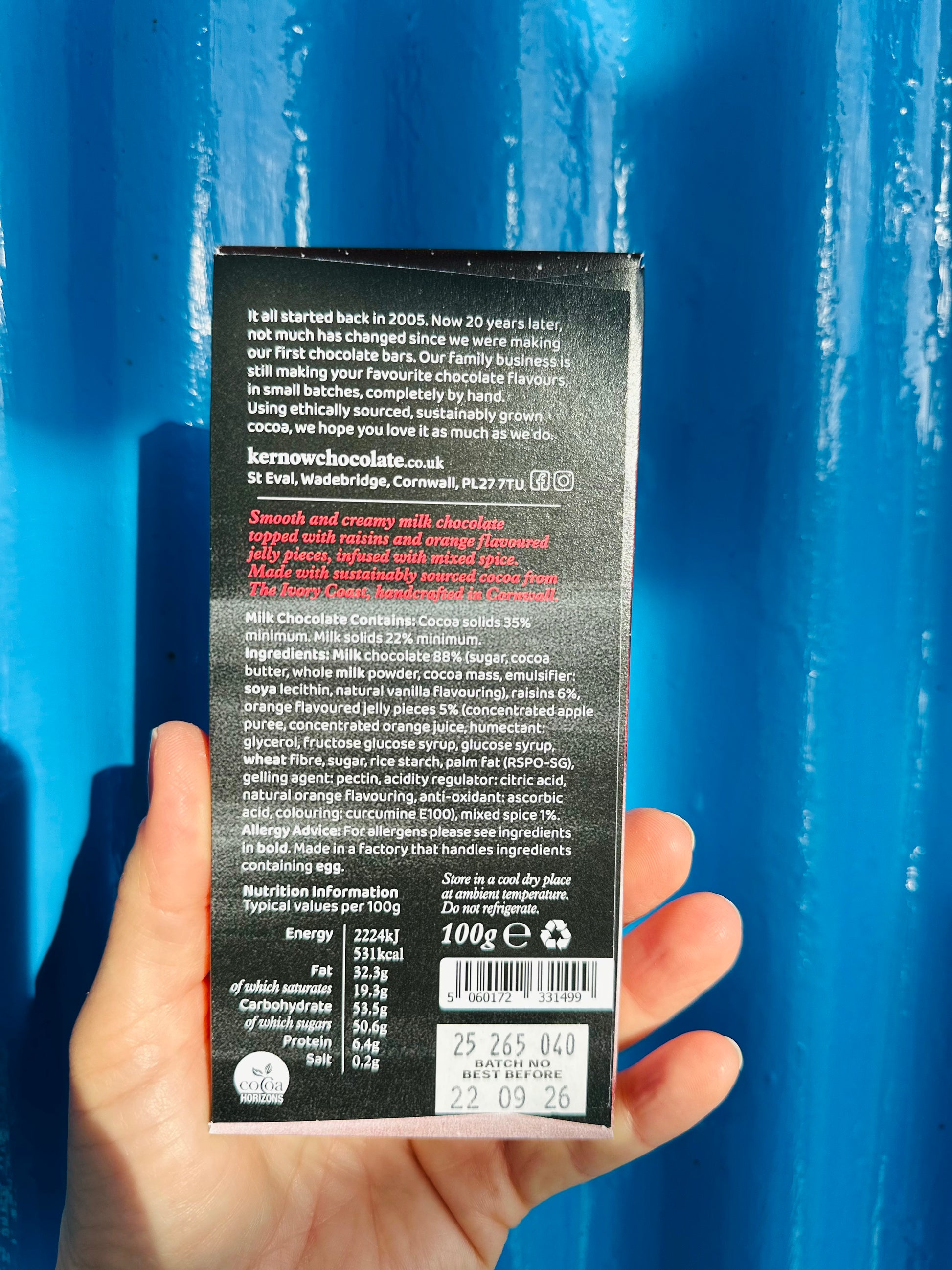Smooth and creamy milk chocolate topped with raisins and orange flavoured jelly pieces, infused with mixed spice. Made with sustainably sourced cocoa from The Ivory Coast, handcrafted in Cornwall.