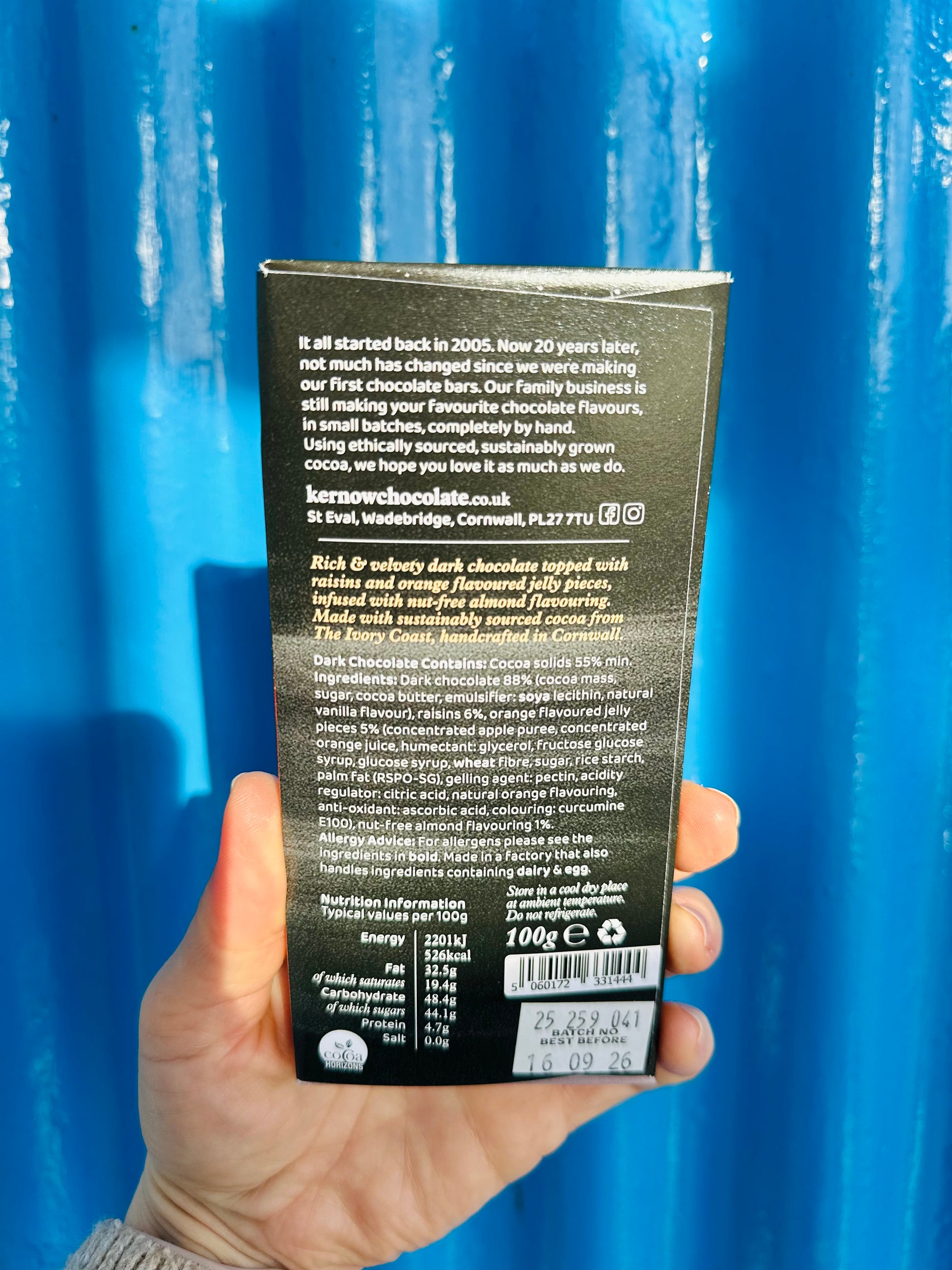 Rich & velvety dark chocolate topped with raisins and orange flavoured jelly pieces, infused with nut-free almond flavouring. Made with sustainably sourced cocoa from The Ivory Coast, handcrafted in Cornwall.